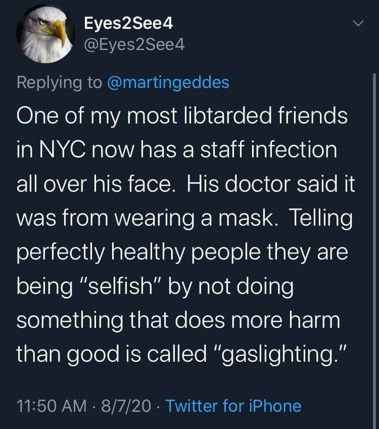 Even the World Health Organization has said asymptomatic people spreading the virus is "very rare," so this forced masking of healthy people becomes more a ritual of submission than an issue of public health, a visual indicator of the compliant versus the dissenters. This works to divide society even further, and there have been many recorded incidents of people in masks becoming hostile and even violent toward people who are not wearing masks.